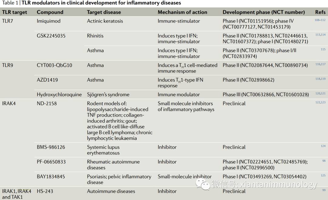 喵评:TLR7和TLR9一个促进SLE,一个保护抑制SLE。TLR7参与B细胞发育及抗体分泌浆细胞的分化,但是药物开发,还没有针对自免开展。