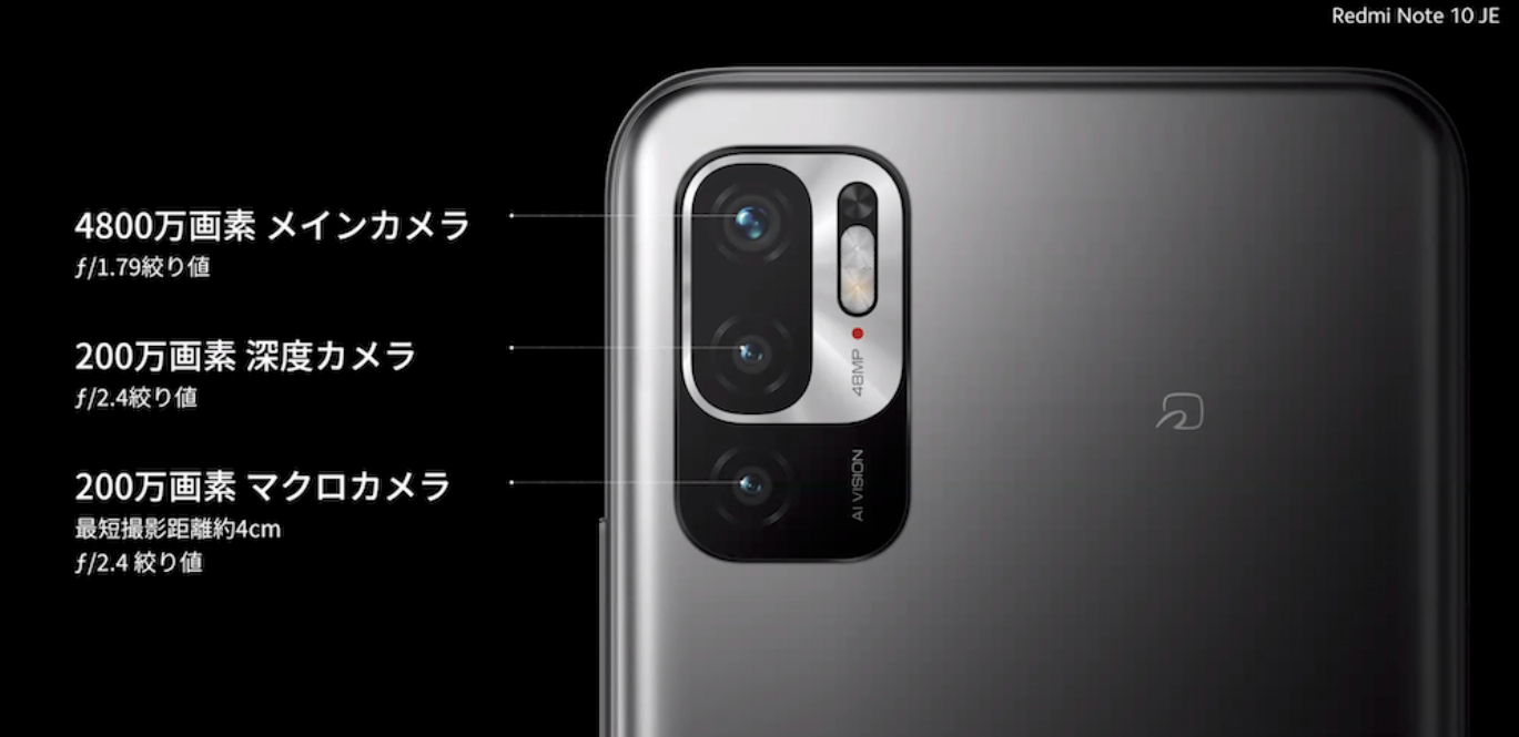 Redmi Note 10 JE 配备了后置三摄,主摄为 4800 万像素,拥有 4800mAh 电池,支持 18W 充电以及侧边指纹识别。