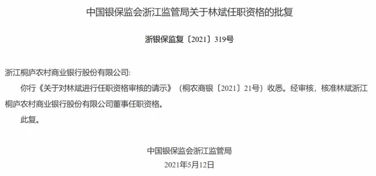 个人履历显示,林斌1973年出生,现年48岁,于2019年8月开始担任嘉兴银行党委副书记、行长。2020年6月3日,经嘉兴银行2019年年度股东大会审议通过,拟聘任林斌为执行董事。一年后,其董事长任职资格终获准。