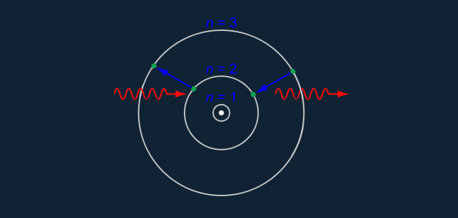 原子由质子、中子和电子组成。质子带正电荷,电子带负电荷,中子不带电荷(电中性)。丹麦物理学家尼尔斯·玻尔设计了一个有助于解释吸收线和发射线的原子模型。在他的模型中,质子和中子在原子核中,电子围绕原子核运行。值得注意的一点是,在这个模型中,电子只允许在距离原子核的特定距离轨道上运行,就像行星只能在一定的距离轨道上环绕太阳一样。离原子核越远,需要的能量就越多。每一个“距离”都被称为一个能级。电子可以在不同能级之间移动,但它需要互换能量。当我们讨论光子的能量时,我们也可以讨论波长,因为这两者是相关的。所需要的能量是由两个能级之间的能量差决定的,并且不同能级,不同元素的不同能级都是不一样的。将元素结合成分子也会改变能量需求。