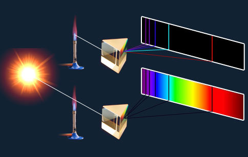 1859年,古斯塔夫·罗伯特·基尔霍夫和罗伯特·本生通过观察元素燃烧时所形成的光谱指出,每种化学元素的放射线都有独特的“特征”,并推断太阳光谱中的暗线是由太阳上层元素的吸收造成的。还有一些事被地球大气中的氧分子吸收。比如用分光仪观察被燃烧的氢气,我们能观察到一组不同的放射线。