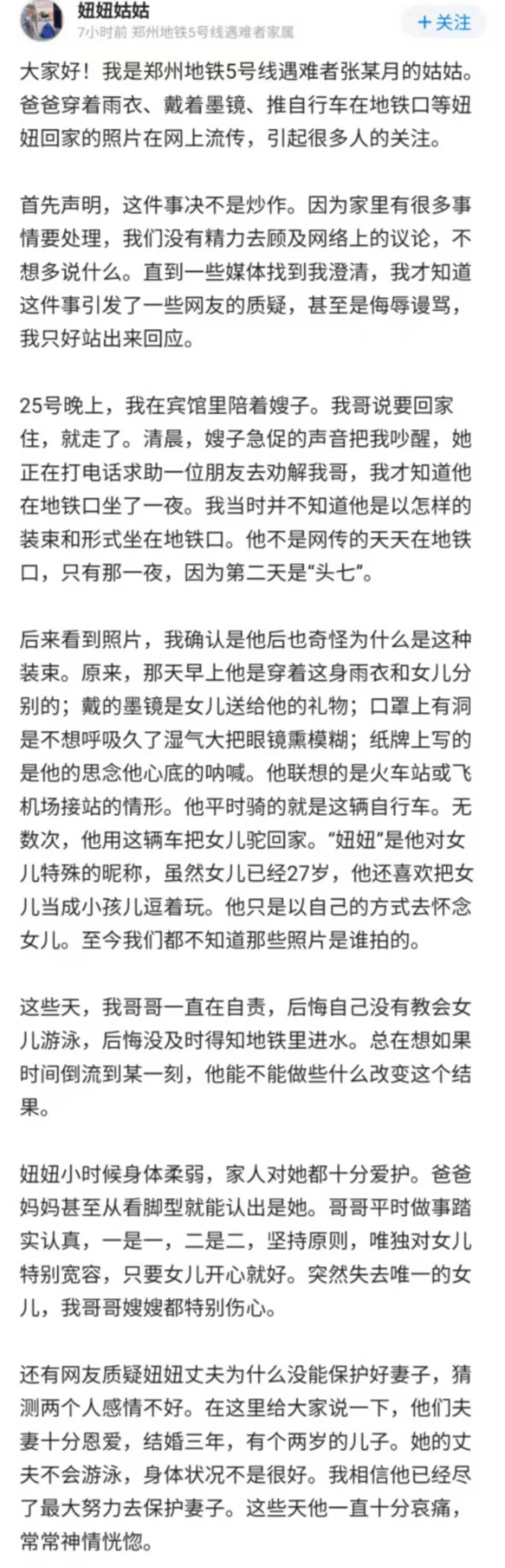 直到“妞妞”的亲姑姑,“雨衣爸爸”的亲妹妹,忍着悲痛还特地出来,给外界说明。