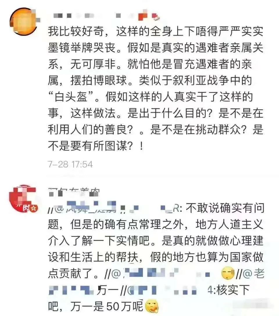 有的认为,照片真假难辨,怀疑“雨衣爸爸”的来历和经历。
