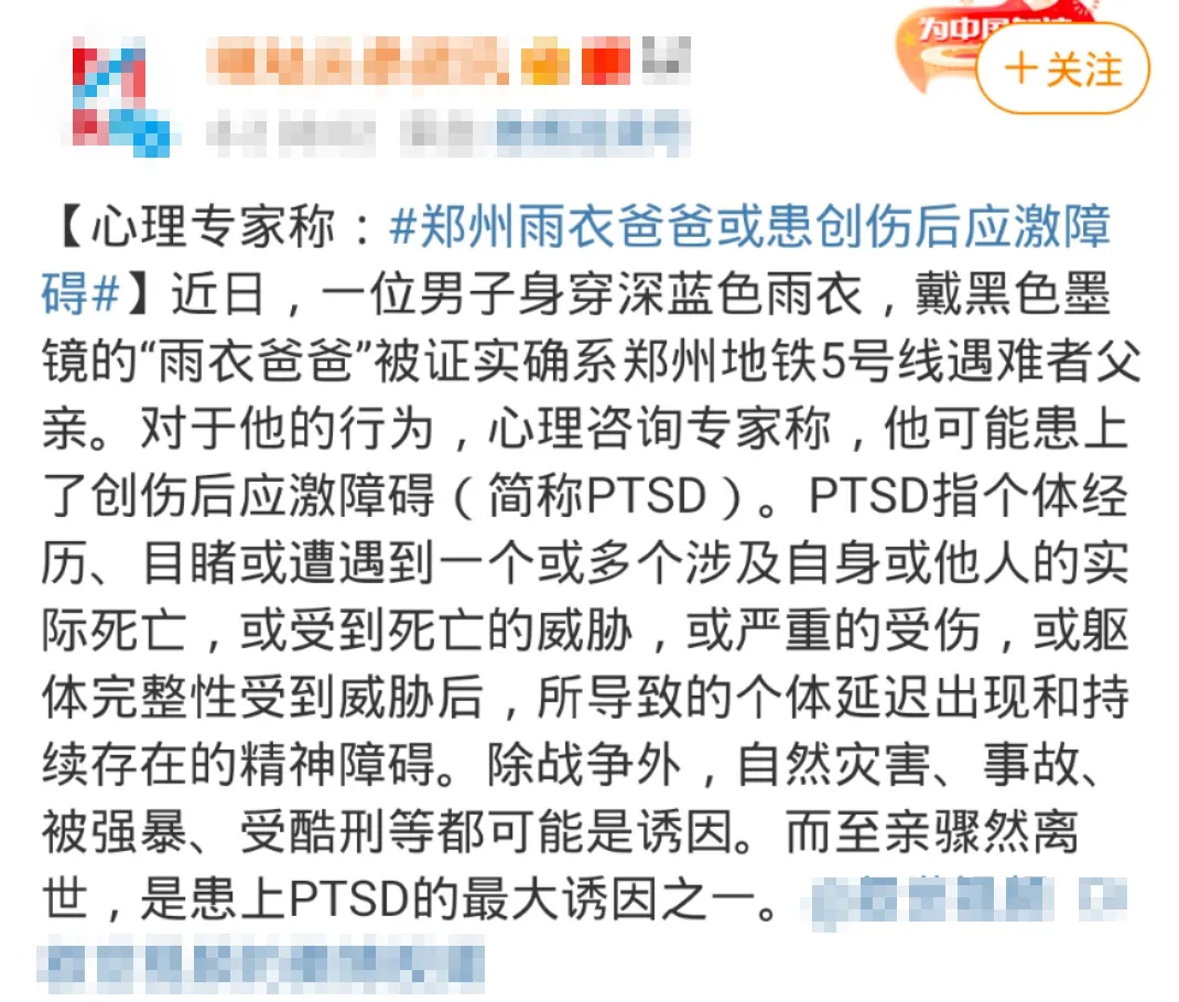 心理咨询师也认为,“雨衣爸爸”的穿着和行为,很有可能出现了创伤后应激障碍(PTSD)。