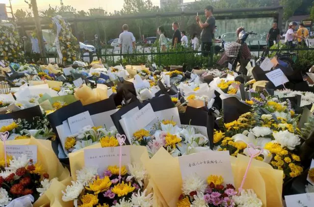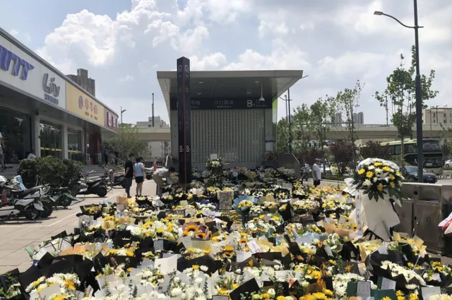 郑州地铁5号线沙口路站出口,铺满了市民自发前来悼念的鲜花。