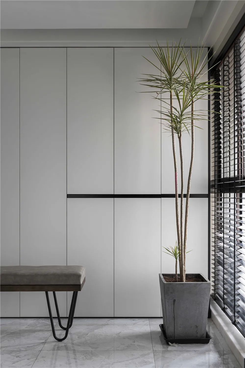 ▲玄关是有个小入户花园,布置换鞋凳、千年木盆栽,窗户装上百叶帘,定制一个大尺寸的收纳柜,整个空间显得简洁优雅而高级,一进门就感受到了主人现代朴素的生活态度。