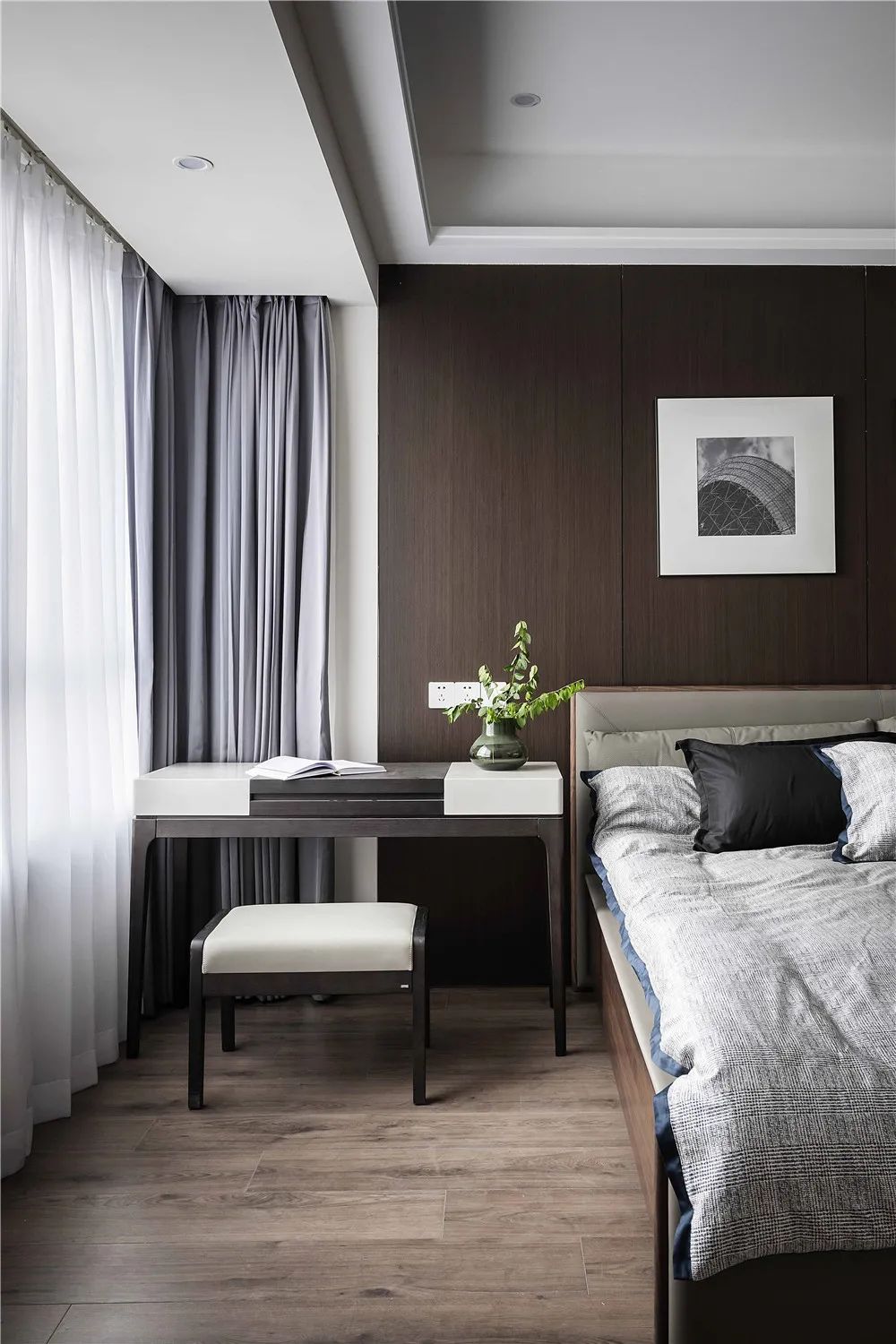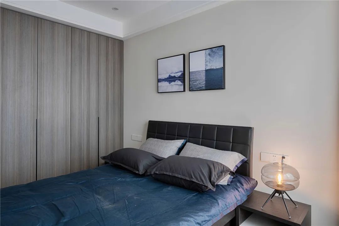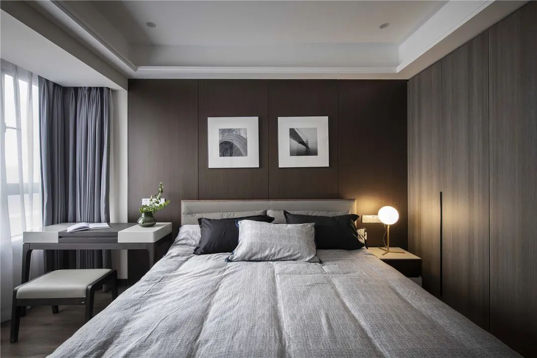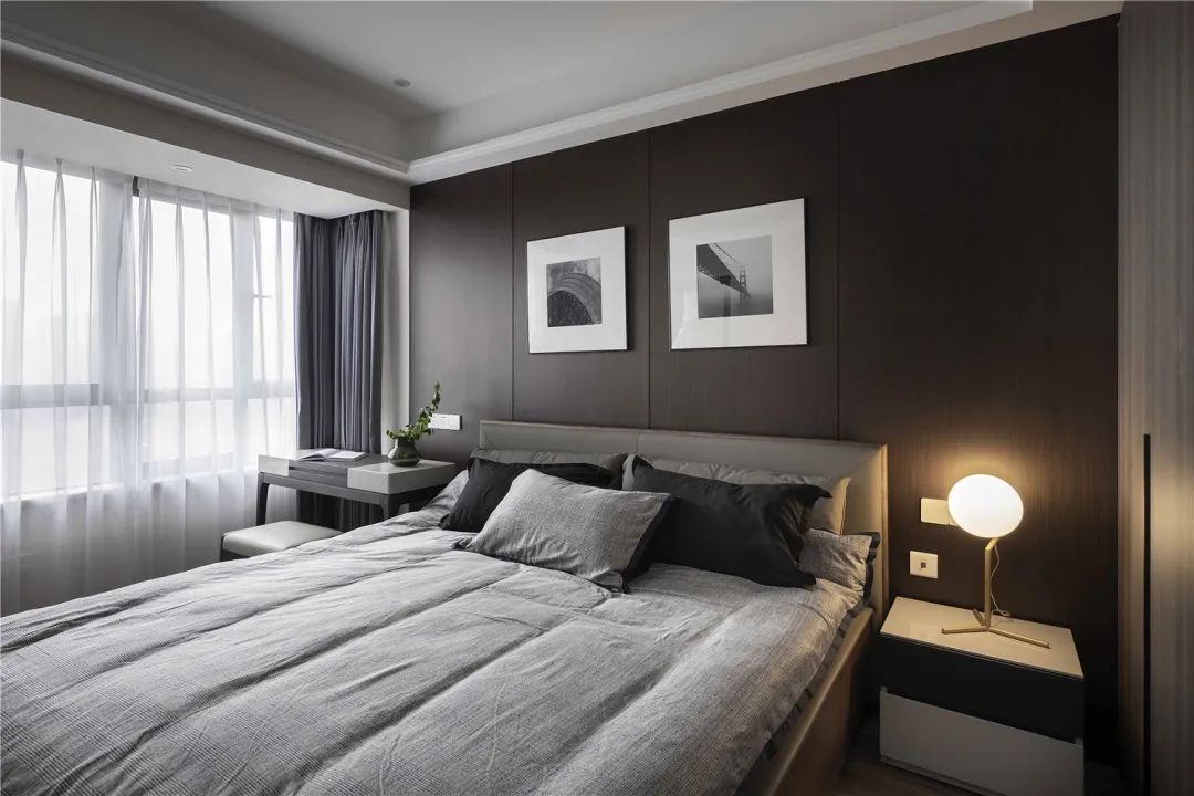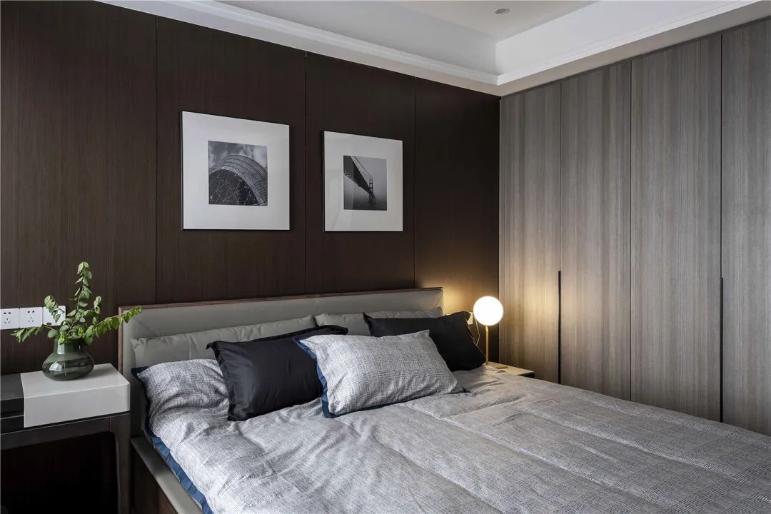 ▲主卧床头墙以深色木饰面为床头墙,挂上两幅方形的黑白装饰画,布置上卡其色的皮艺床、灰色床单,整个空间显得格外的现代优雅而高端。