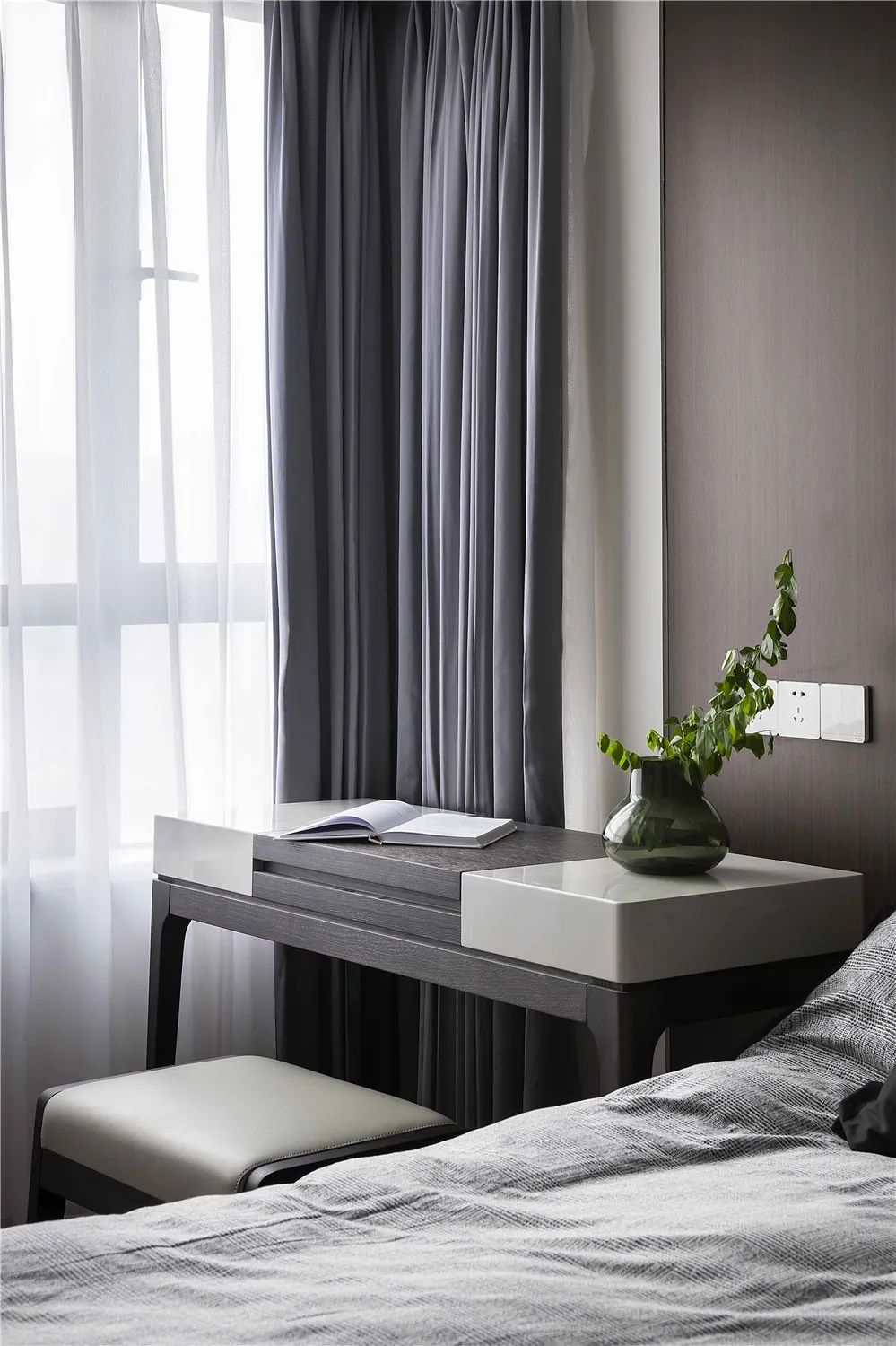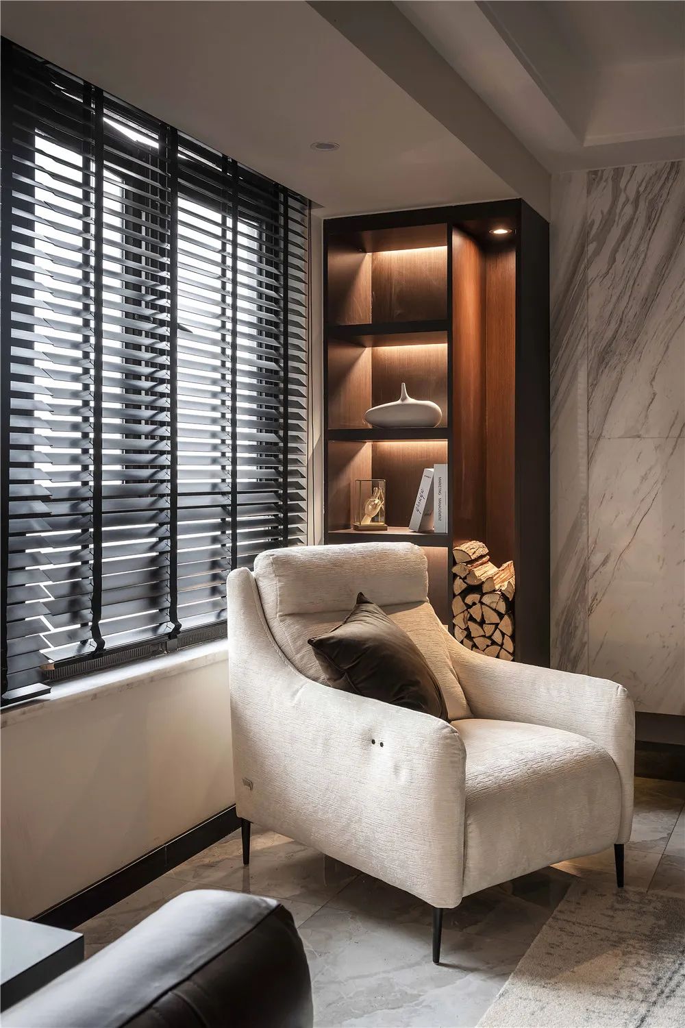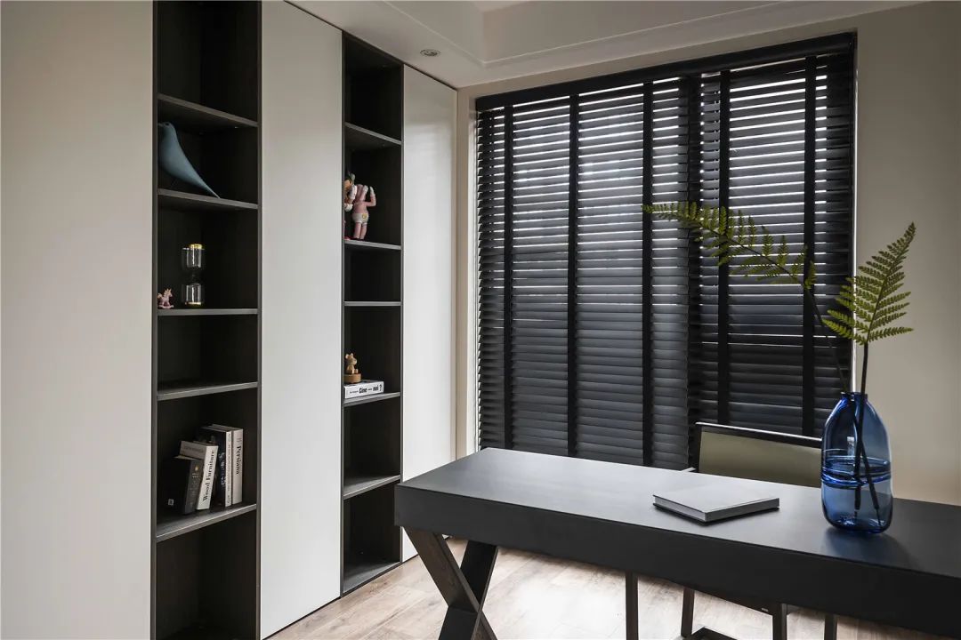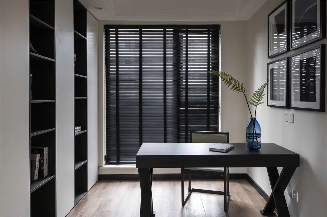 ▲书房空间布置一张书桌,侧边墙面装饰收纳柜书籍,落地窗装上黑色的百叶帘,整个空间显得沉稳端庄而高级,为主人工作阅读提供了一个舒适方便的体验。