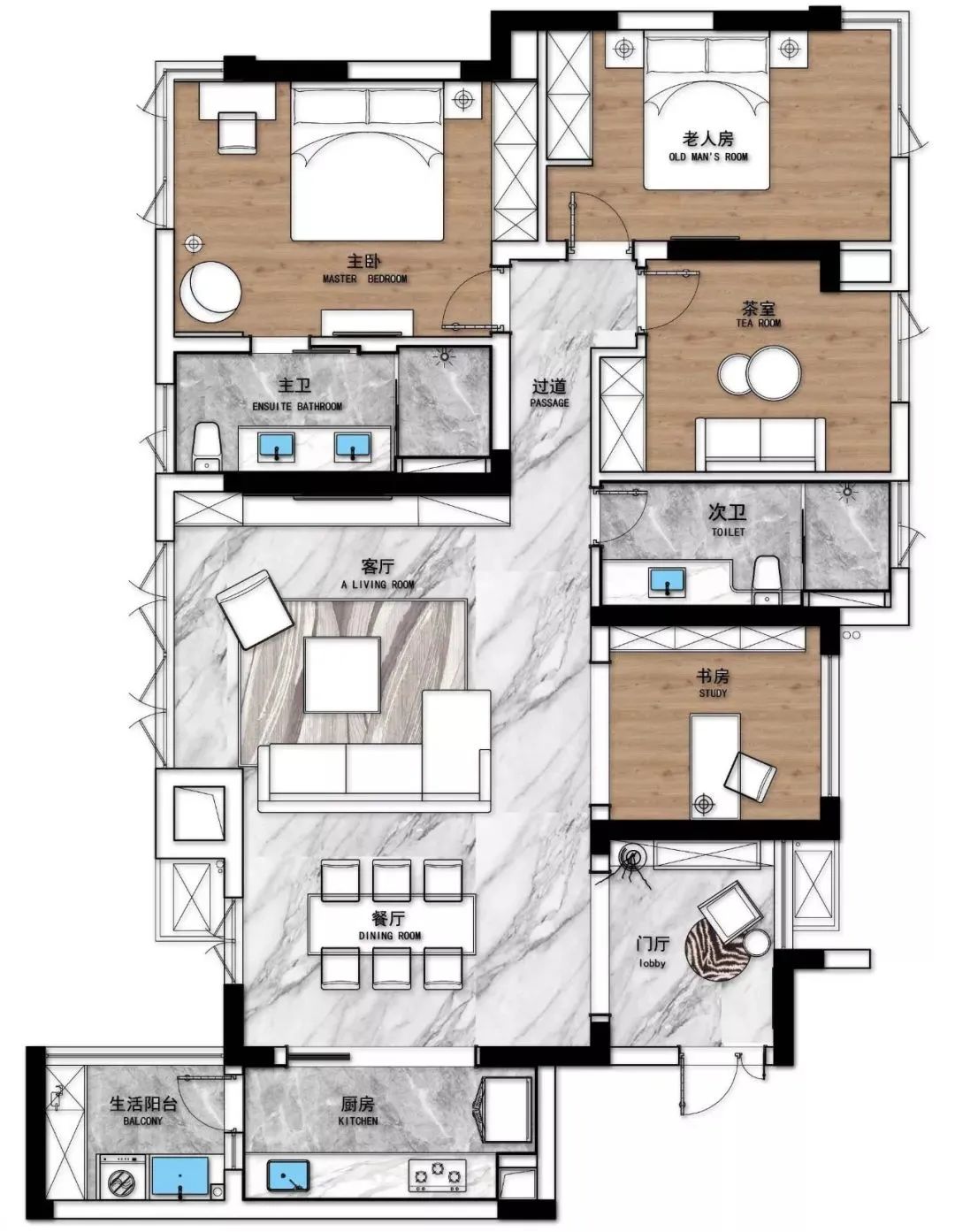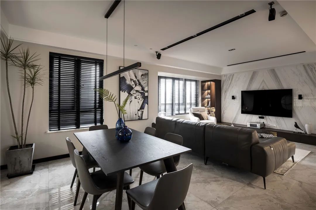 在这套114平米的房子中,整体空间以现代风的设计,空间内加入大范围的黑白配设计元素,大面积岩板、木饰面的材质,让空间显得档次高级,而黑白配的家具与细节设计,也让空间显得更加稳重端庄而素雅。