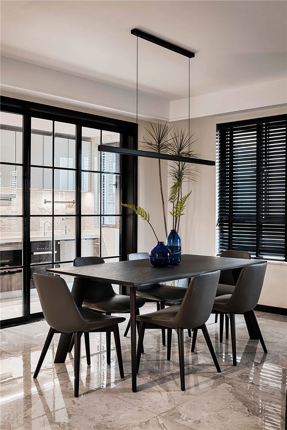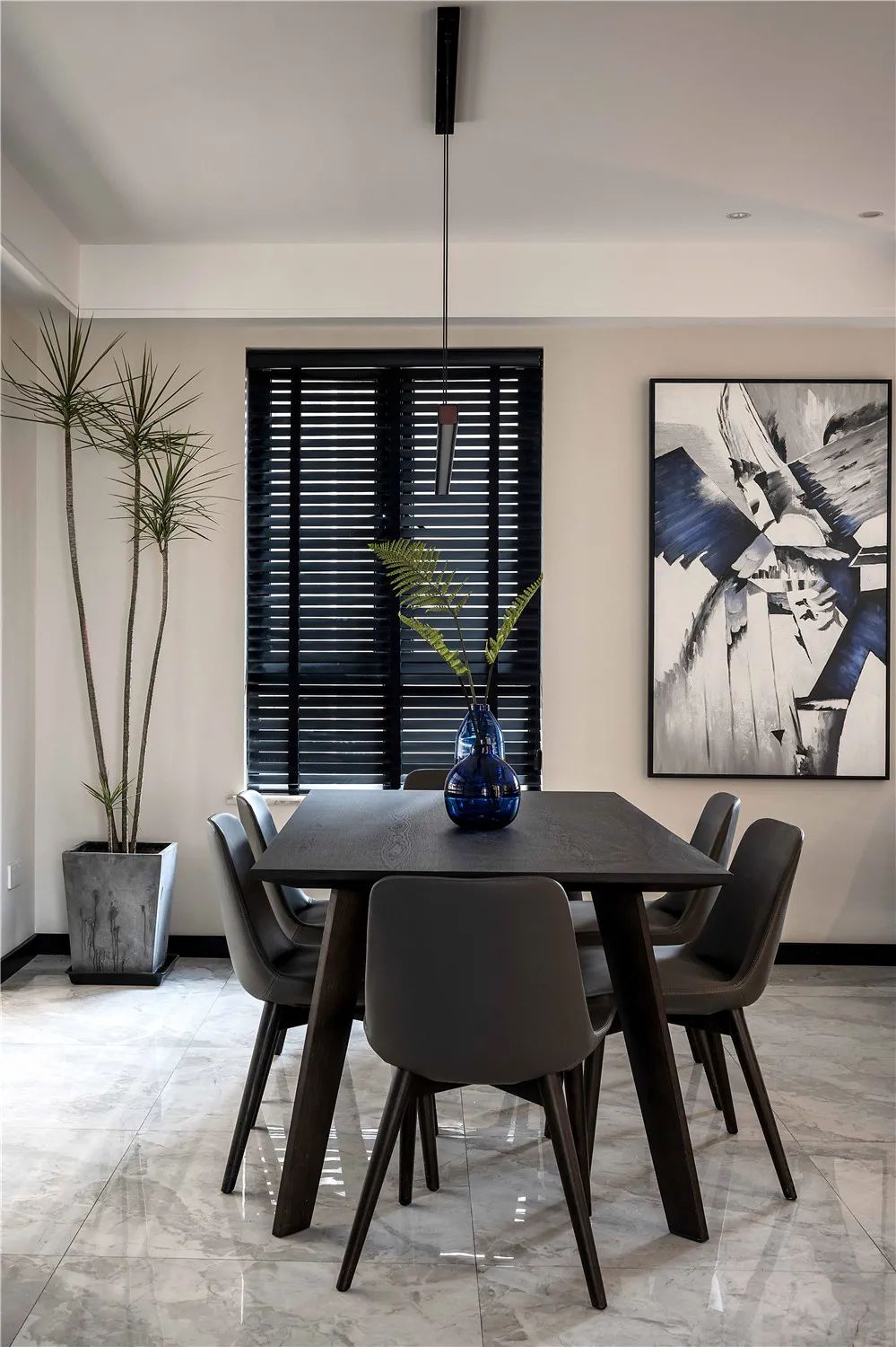 ▲深色的实木餐桌+皮艺餐椅组合,角落一盆千年木盆栽,客餐厅之间的墙面还有一幅黑白色调的挂画,而灯具与细节上也是以黑色调为主,整个空间显得格外的时尚高级。