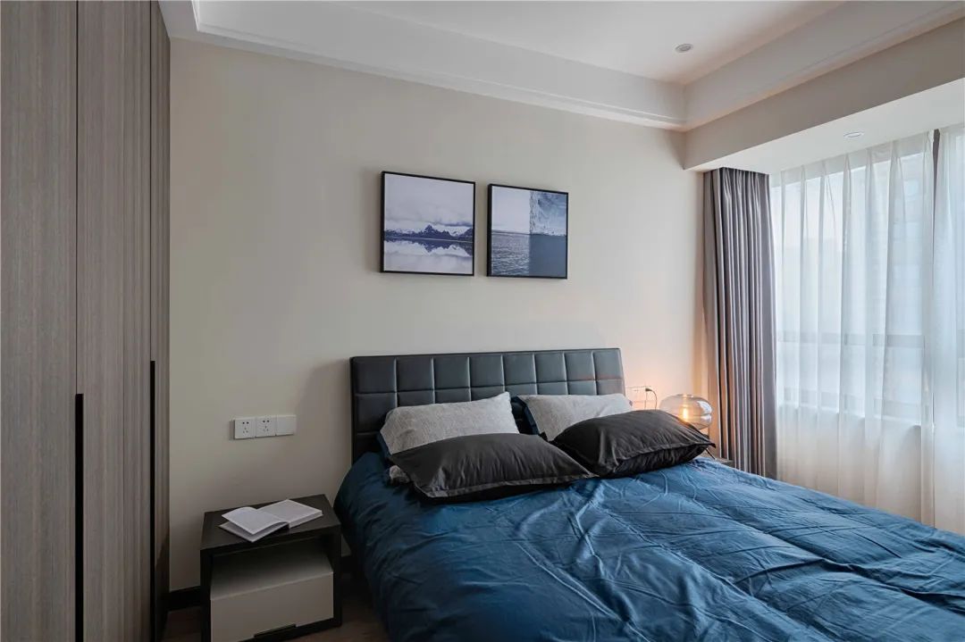 ▲父母房以淡黄色的墙面基础,床头墙挂上蓝白色的海洋主题装饰画,布置一张皮艺靠背的实木床,两侧布置实木材质的床头柜,,侧边原木色的衣柜布置,整个空间显得现代舒适而简洁。