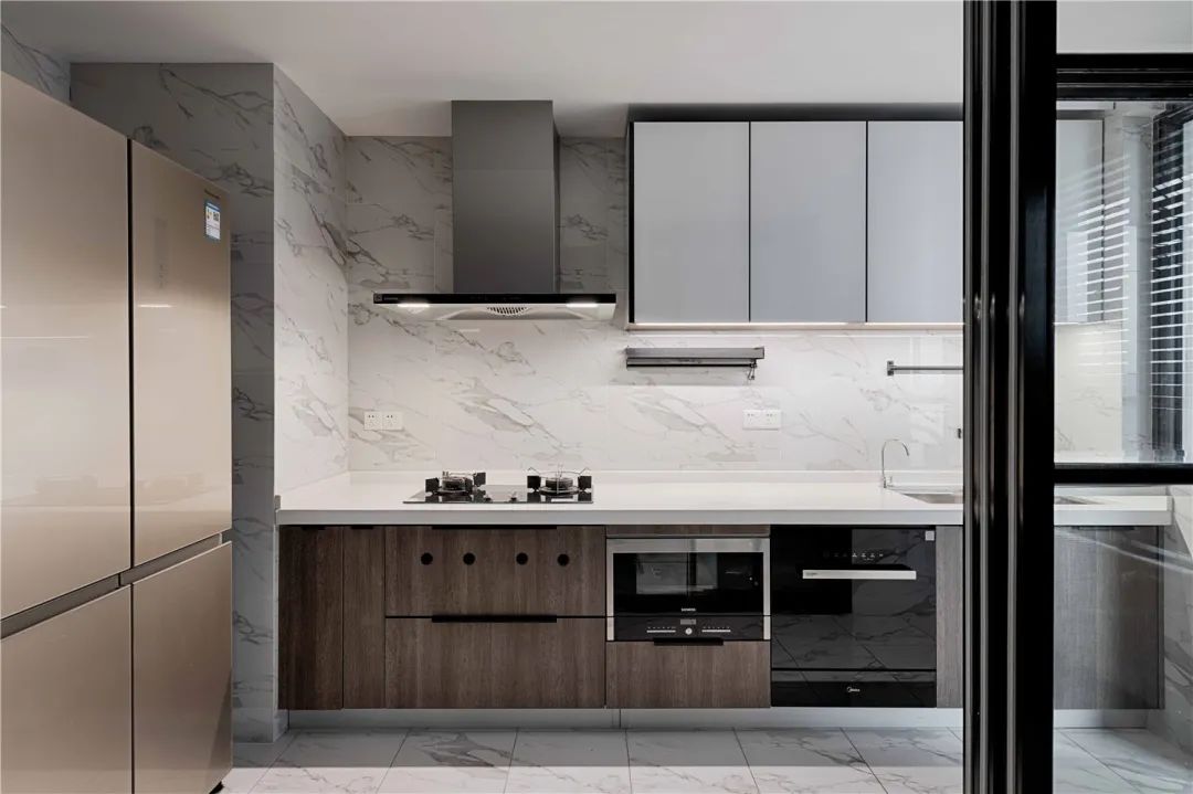 ▲厨房墙面地面都以雅白的瓷砖设计,装上木色的橱柜+白色吊柜,加上嵌入式电器,整个厨房都显得现代简约而实用大气,为做饭提供了舒适方便的体验。