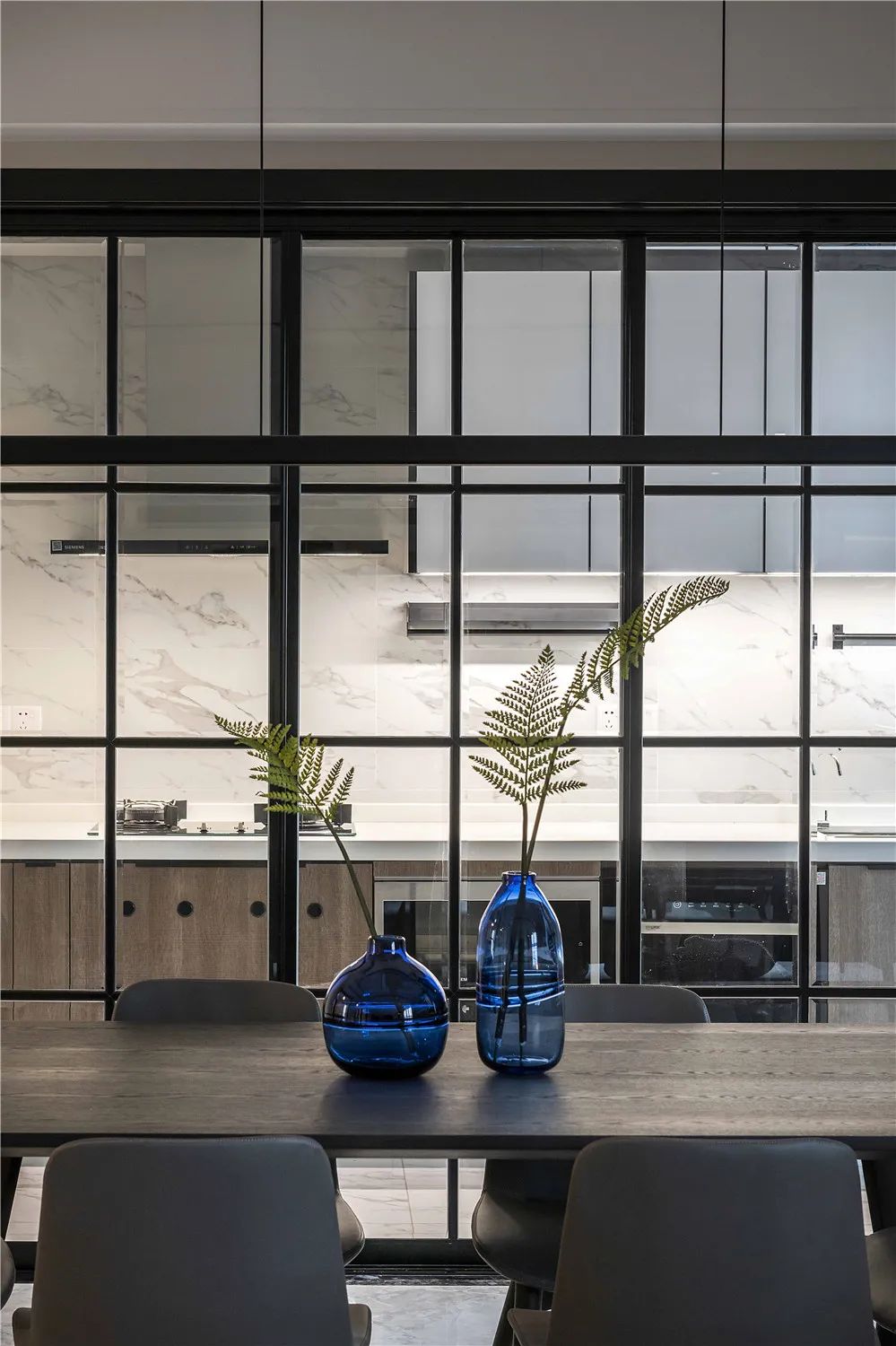 ▲厨房以黑框玻璃推拉门设计,厨房内的画面一目了然,整个空间也是显得更加优雅时尚而大方。