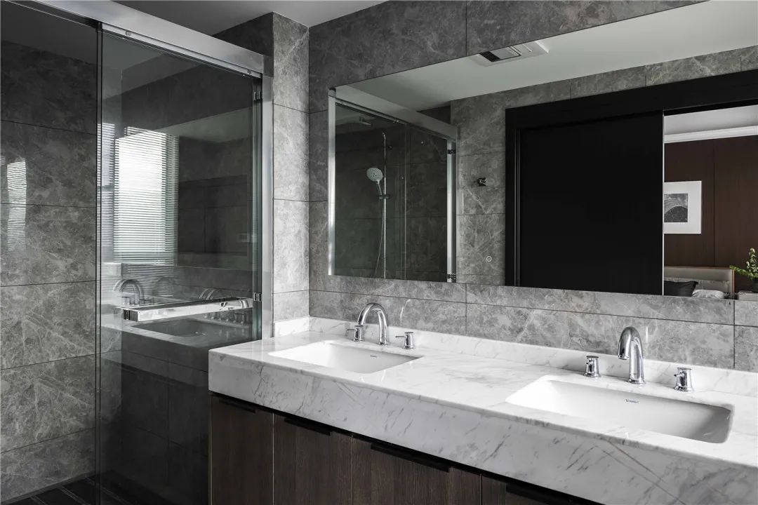 ▲卫生间灰色墙面砖的空间,装上双人位的洗手盆,还有大尺寸的镜柜,整个空间显得实用优雅而时尚。