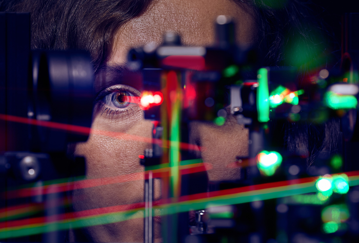 研究主要作者 Jenny L. Reiniger 在激光检眼镜上进行测量/Credit:Volker Lannert/Uni Bonn