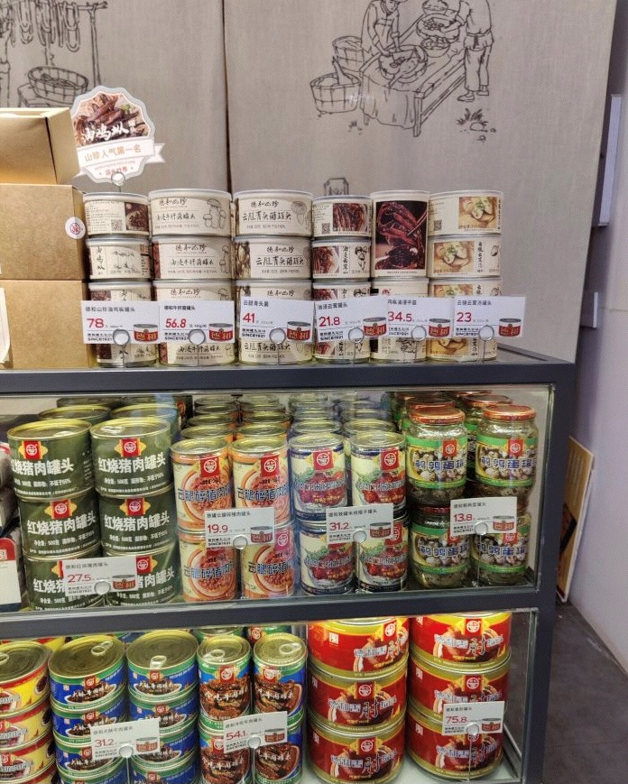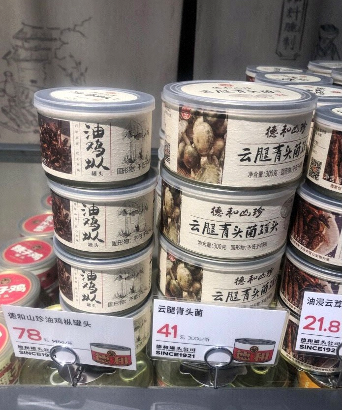 麻辣小龙虾、红烧猪肉、红烧排骨、梅菜扣肉...只有你想不到,没有德和做不到, 就连云南的菌子也是可以做成罐头的,云腿云茸汤、油浸云茸、油鸡枞、青头菌...