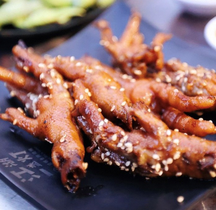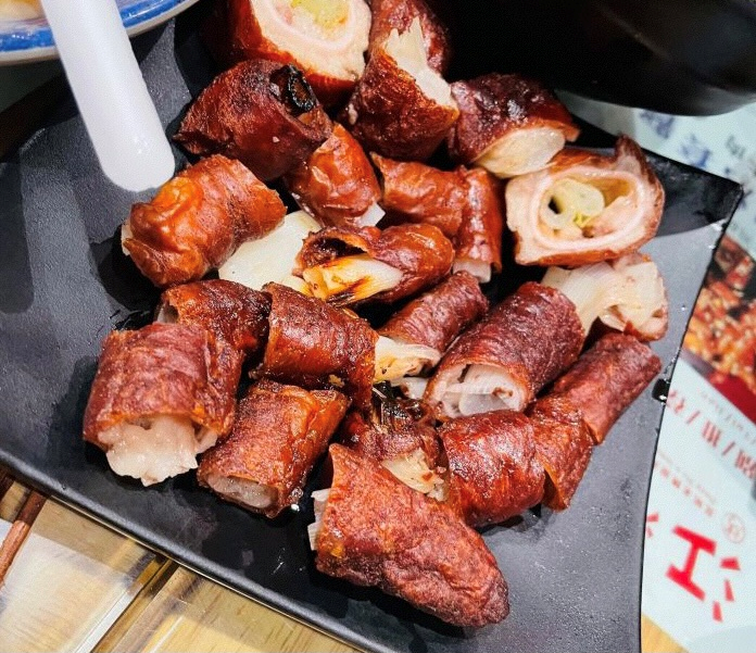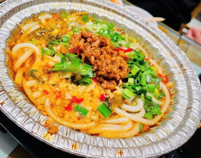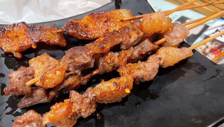 入夜,江湖灯亮,葱肠、包烧米线、烤五花肉、招牌小肉串、特色鸡脚就开始招呼客人。