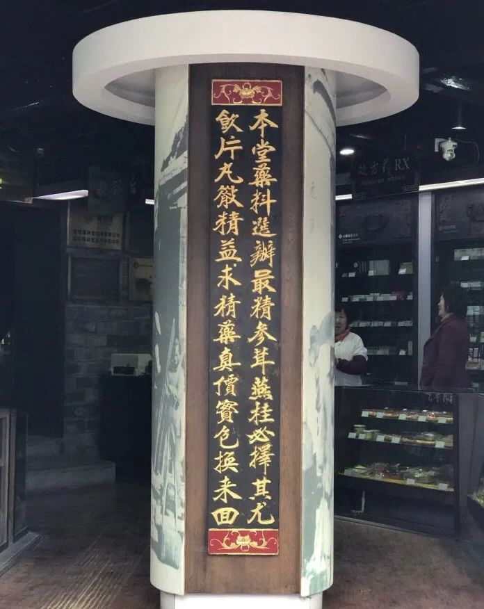 进得店堂,中柱上的直匾写的是:"本堂药料选办最精,参茸燕桂必择其尤,饮片丸散精益求精,药真价实包换来回。"