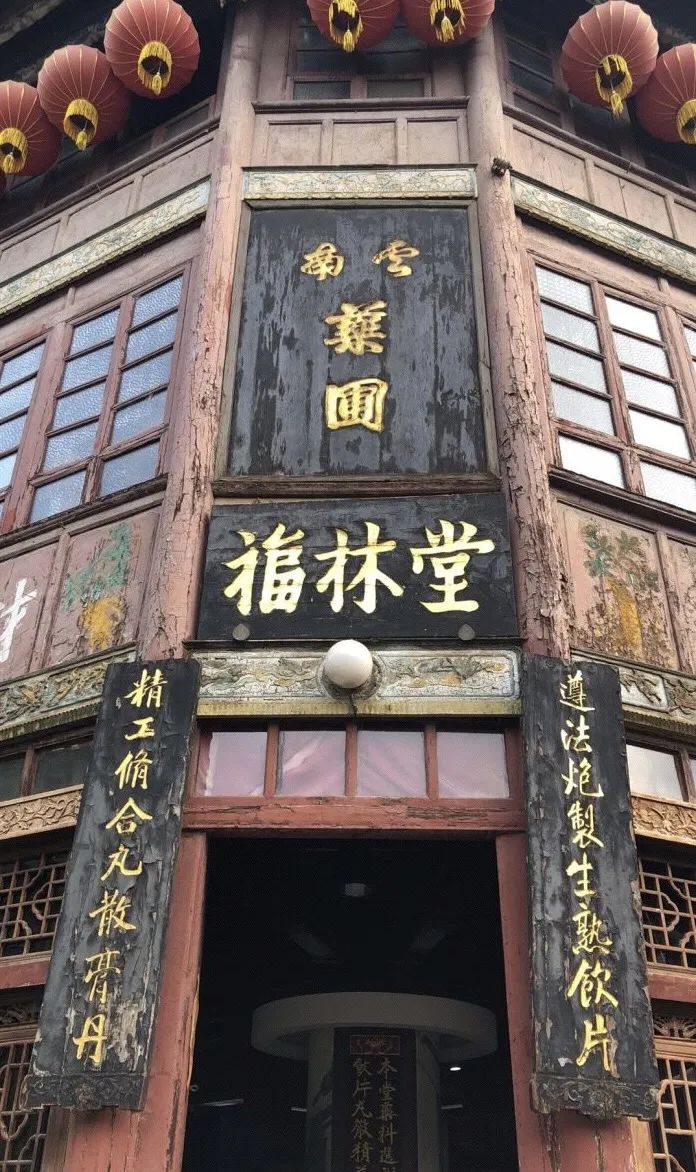 这座三层楼木结构的纯中式建筑,店门上方,是直书的三个大字"福林堂";两侧对联,是"遵法炮制生熟饮片,精工修合丸散膏丹"。