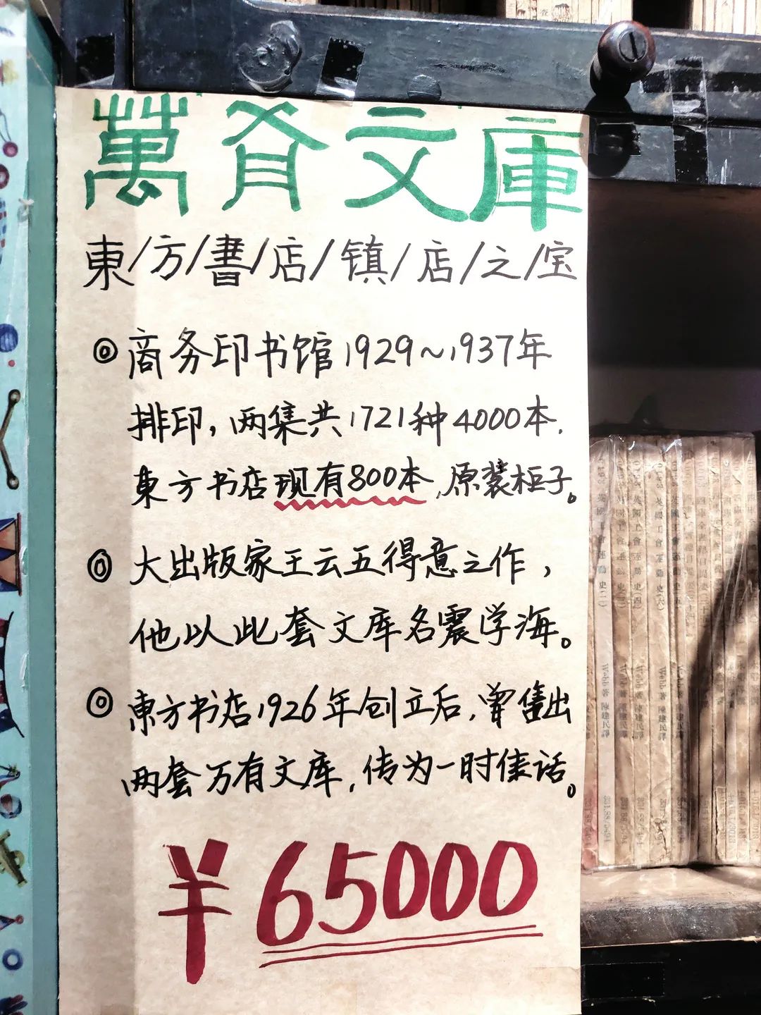 镇店之宝是一套有800册的万有书库,标价6.5万,自创立后一共就售出过两套。