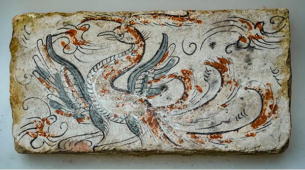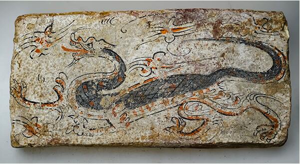 这两块砖都是在白色底色之上用墨线勾勒再敷彩而成的,分别描绘了青龙和朱雀的形象。青龙是“四神”(青龙、白虎、朱雀、玄武四种神灵动物的组合)之首。“四神”图像是中国传统文化里面的典型构图形式,反映了古人对时空方位的思考。汉代以后,“四神”图象常出现在墓葬中,与当时镇墓升仙的思想有关。两件画像砖所绘的青龙与朱雀,线条蜿蜒流畅,气势磅礴,神采飞扬,展现出所绘对象非凡的风姿和魅力。