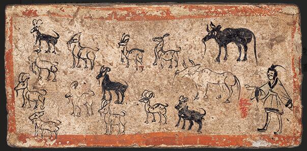 这件《牧畜画像砖》四周带有朱红色边框,描绘了十四只成群的牛、羚羊形象,右下角有一位身穿魏晋长袍的男子正在放牧。画像中的牛羊形象分别以线条勾勒而成,黑白交错,生动活泼,构图有大小、主次、疏密之分,画工绘画技法的纯熟可见一斑。