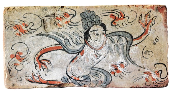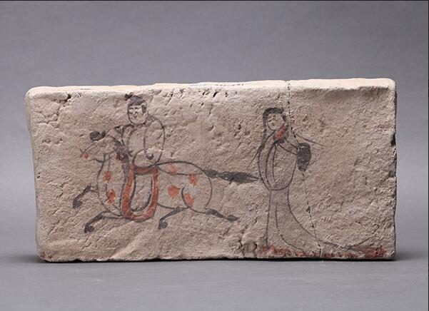 羽人砖,魏晋,长方形,白粉涂底,墨线勾勒人物。金昌市博物馆藏