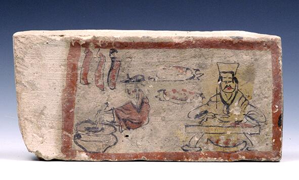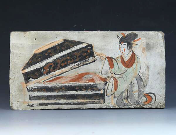 《仕女开箱画像砖》白色的砖面上仅绘一人一物,画面明净雅致,富有美感。画中女子五官清晰,发髻高耸,衣着精美,两颊饰以红点十分娇俏,可见这种流行于唐宋时期的“妆靥”在魏晋时便已出现。女子持跪姿,一手开启箱盖,一手取物,非常富有动感和生活气息。