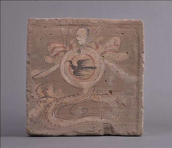 伏羲女娲是中国古代神话中的人类始祖。这块画像砖呈方形,画面中央彩绘一伏羲图像。伏羲人首蛇身,右手持规,头戴山形冠,胸部有日轮,日轮中央画有一只正在展翅飞翔的墨鸟,又叫“金乌”,负责每日运载太阳的日出日落。对自然界中无法解释的诸多现象,我们的古人就是这样赋予了它们如此唯美、浪漫和富有神话色彩的形象。