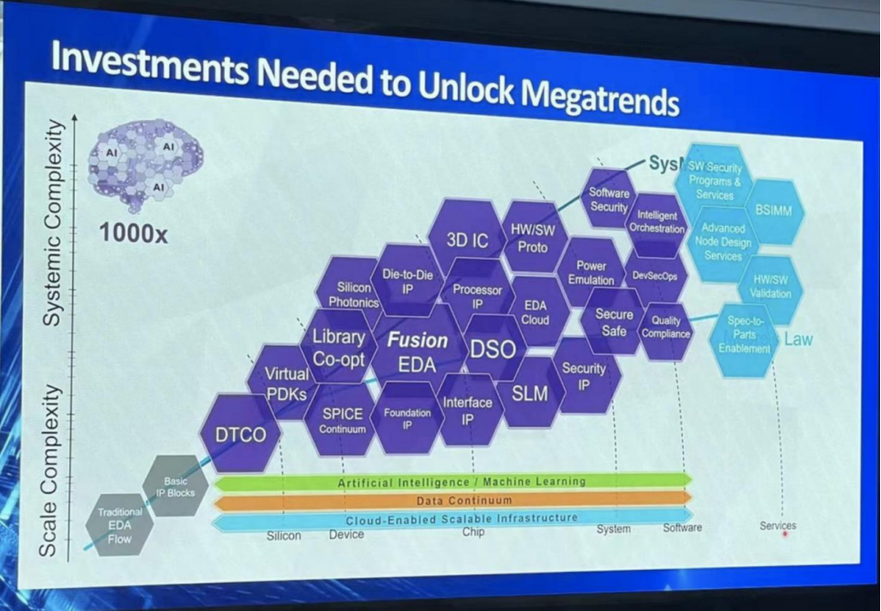 下面这张图简要介绍了新思科技是如何从硅、器件、芯片、系统到软件、服务,一步步实现1000倍的生产率。