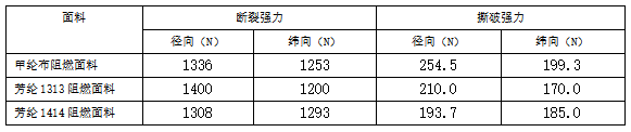 消防阻燃面料的断裂强力及撕裂强力在扑救森林火灾中对保护消防员身体起到一个至关重要的作用6,表3是本次实验三种面料的断裂强力及撕破强力数据。可以看出,径向的断裂强力最高为芳纶1313阻燃面料,达到1400 N,纬向断裂强力最高为芳纶1414阻燃面料,达到1200 N。而甲纶布阻燃面料断裂强力介于两者之间。但是甲纶布的撕破强力分别达到径向254.5 N和纬向199.3 N,高于其余两种面料。综合数据来看,甲纶布阻燃面料更优于芳纶1313及芳纶1414。