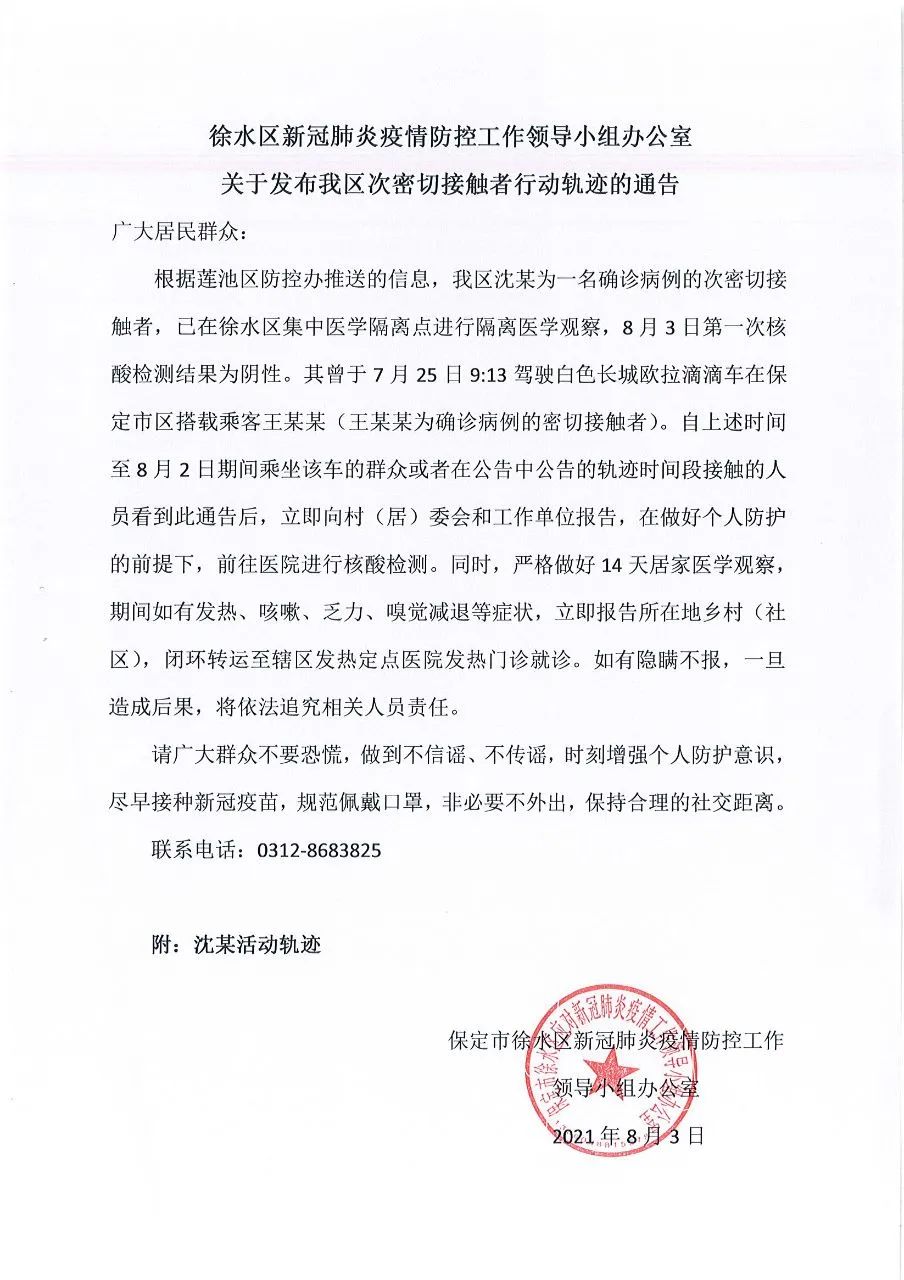 保定市徐水区新冠肺炎疫情防控工作领导小组办公室关于发布我区次密接触者行动轨迹的通告