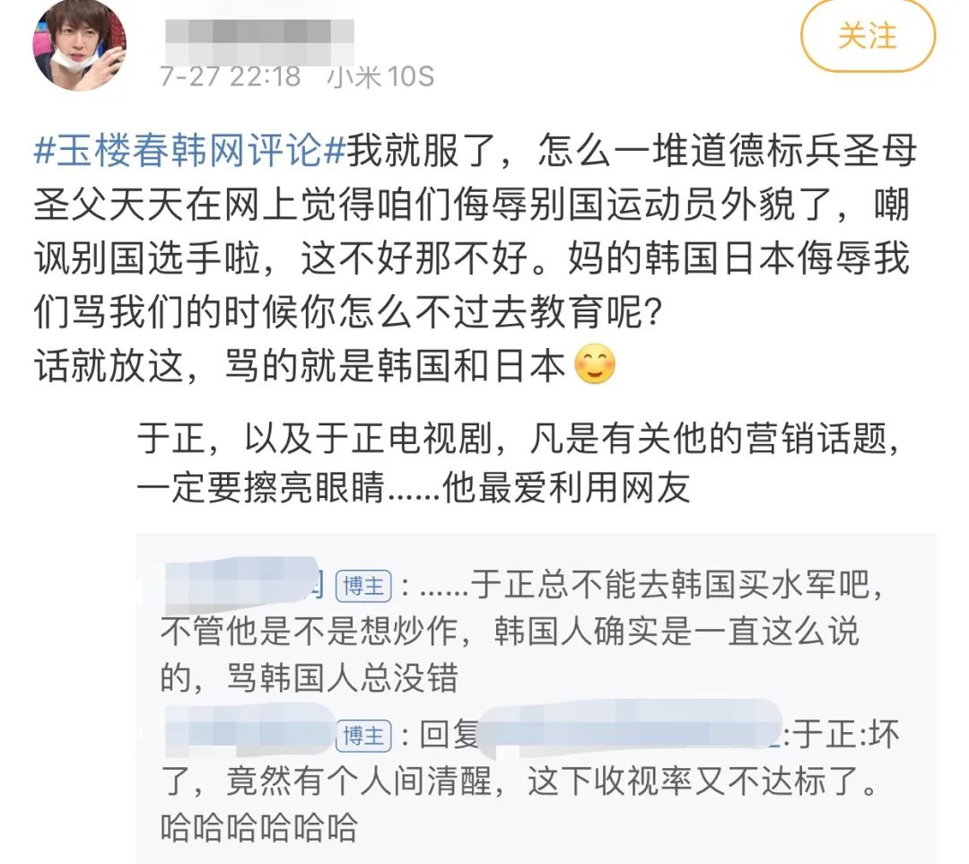 骂韩国人贼喊捉贼的、找于正茬的、趁机安利本剧的,甚至还有借题发挥,怒斥韩国人践踏体育精神和不知廉耻的,统统打成一团。