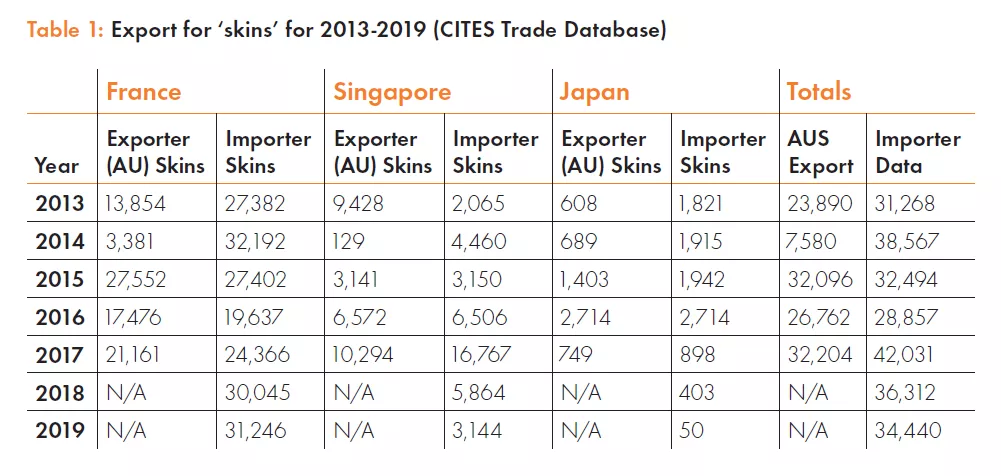 2018年和2019年,澳大利亚未提交年度出口数据,然而其他国家提供的进口数据显示,澳大利亚并未停止出口鳄鱼皮,两年间仅出口到法国的鳄鱼皮数量每年都超过3万件。