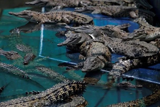 在集约化养殖场,鳄鱼被高密度圈养在狭小的围栏里,每平方米圈养的鳄鱼达5-10条,令它们无法表达自然天性。