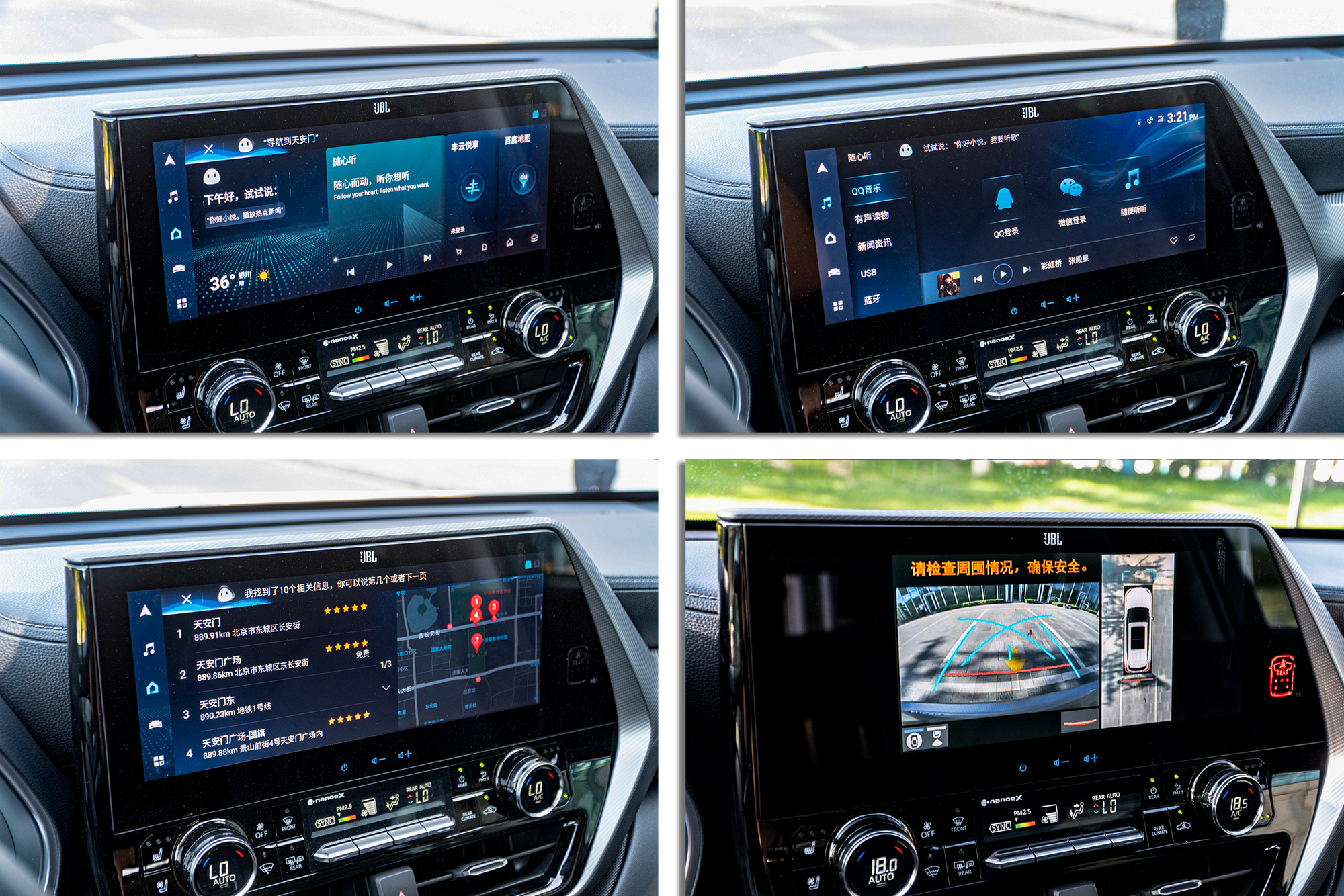 本次体验过程中,全新汉兰达的中控区域让我留下了很深刻的印象。首先新车并没有采用全触摸设计,而是保留了大量实体按键,并且按键的阻尼感也不错,非常人性化,便于盲操作。其次,这块中控屏的分辨率和细腻程度相比上一代车型进步明显,UI设计终于有原厂大屏的感觉了,支持人脸识别,语音交互和手机互联,并且还支持百度地图、QQ音乐、爱奇艺等常用APP。我试驾的这台双擎 2.5L 四驱至尊版可以通过在手机上下载官方APP来查询车辆状况,还能实现远程控制和实时定位,这个功能在商场或者车站找车时非常实用。