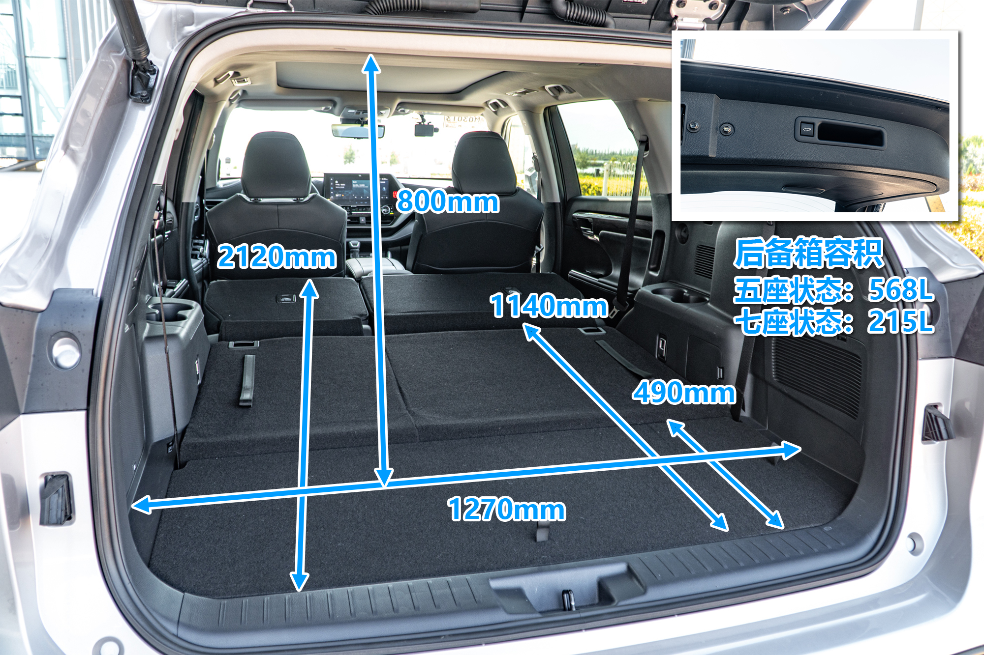 尾箱方面,全新汉兰达继承了前几代产品的优良传统,整体设计非常规整,放倒座椅后可以形成一个纯平的空间,并且全新汉兰达行李箱长度增加了50mm,放倒座椅后进深达到了2120mm,日常搬家和自驾露营完全没有问题。即便在打开第三排座椅的情况下,也能放下一个24寸行李箱和一个20寸登机箱,应付七人短途旅行完全没有问题。