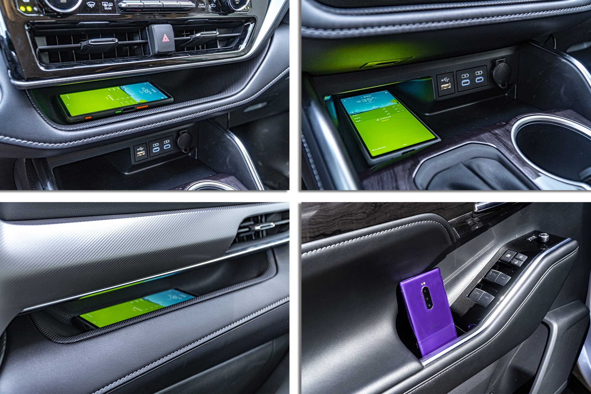 前排储物空间方面,全新汉兰达依旧称得上行业标杆。以出门必不可少的大屏手机为例,全新汉兰达可以放大屏手机的储物空间非常多,并且在挡把前方设置了一个USB接口,两个type-c接口和一个12V电源接口,充电非常方便。