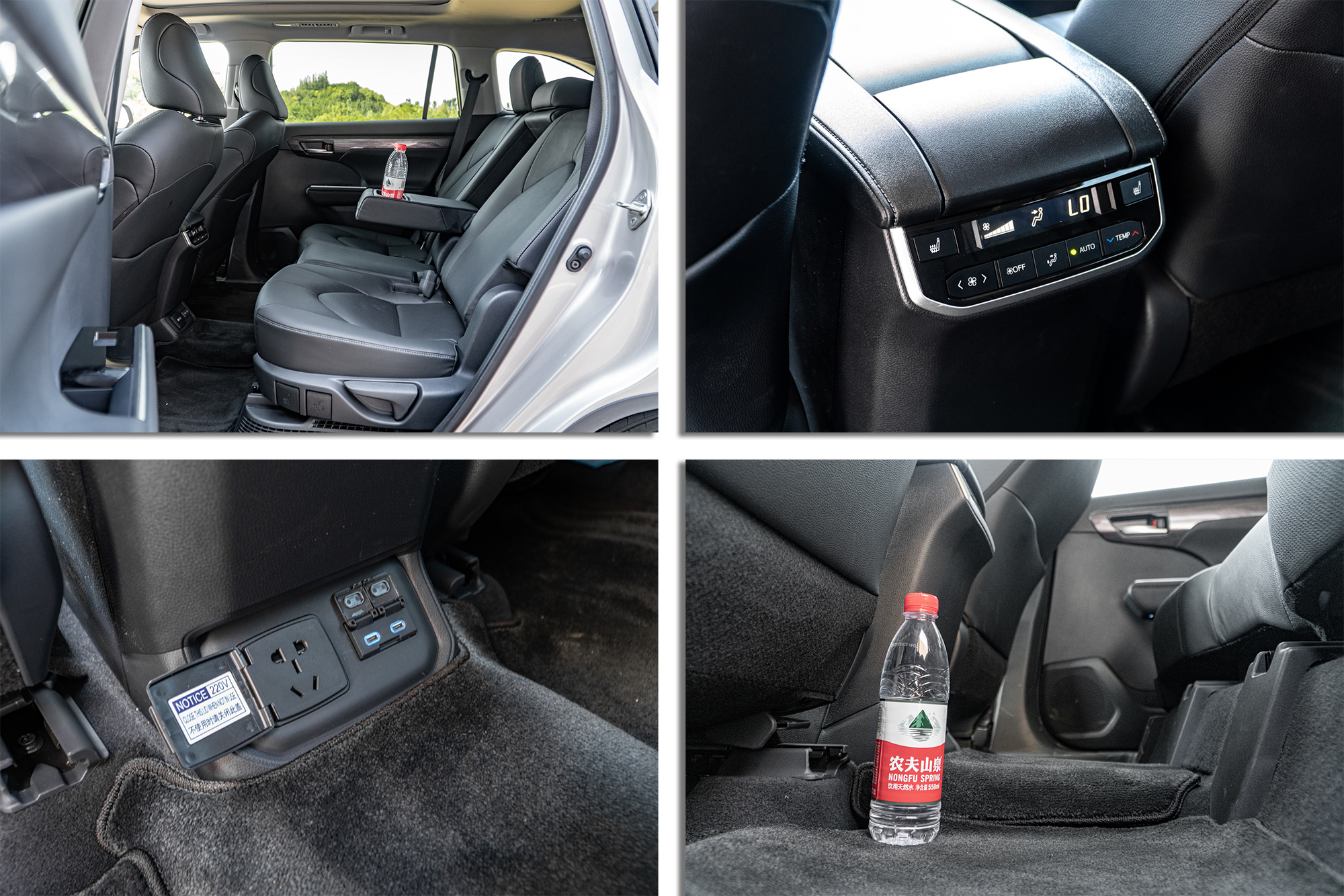全新汉兰达对第二排乘客的照顾更加到位。首先第二排座椅不仅支持前后调节和比例放倒,而且靠背角度的调节角度也非常大,基本能形成一个半躺的坐姿,坐起来非常舒适。其次,在配置上第二排装备了座椅加热、独立空调,并且在两个type-c接口基础上还增加了一个220V电源,自驾游时给无人机、相机和平板电脑充电非常方便。空间表现方面,头部空间会比上一代小大约两指,可能是因为全新汉兰达的全景天窗面积更大,天窗的遮阳帘收放机构正好在第二排座椅靠背上方,可以掏空的余地变小了。第二排地台中间有一点凸起,而上一代这里是纯平的,不过这样的凸起高度对中间乘客的影响并不大。