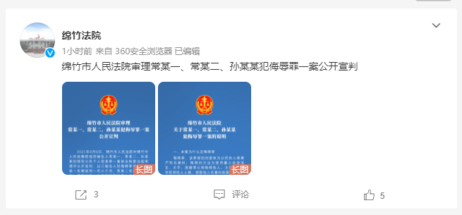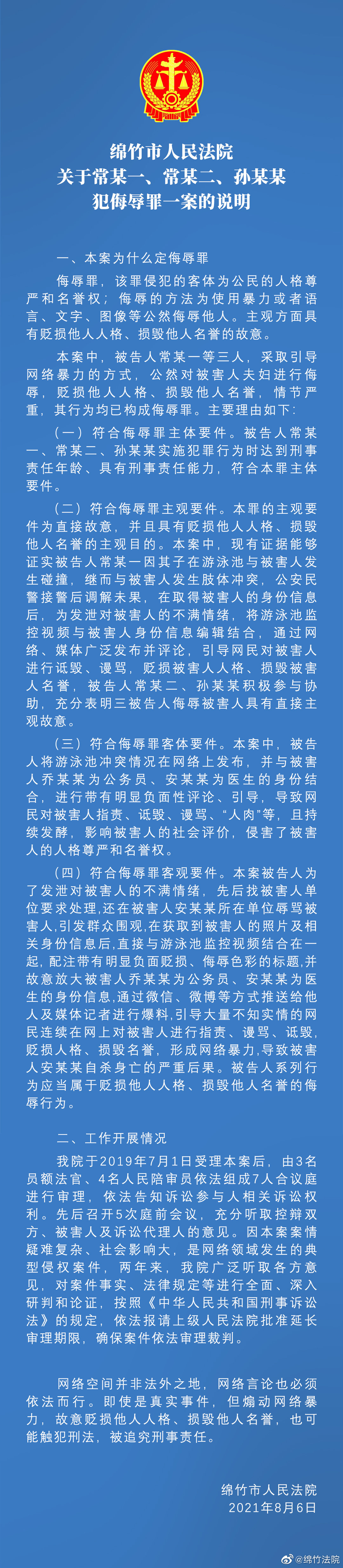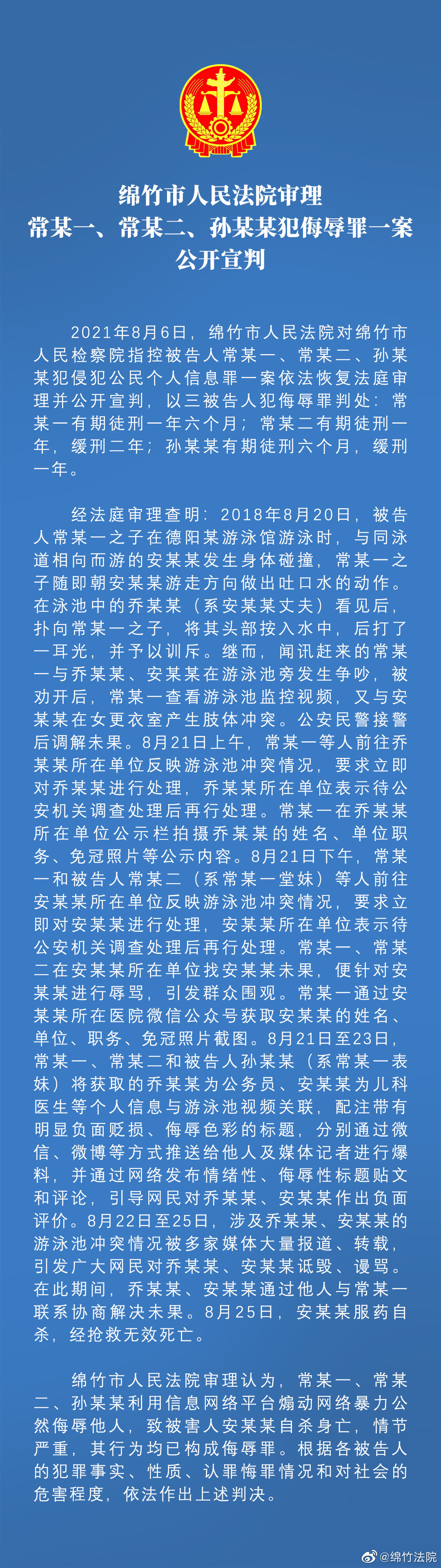 2018年8月20日,四川德阳的一名女医生安女士遭网络暴力卷入舆论旋涡后自杀。8月6日,四川省绵竹市人民法院发布消息称,该院审理常某一、常某二、孙某某犯侮辱罪一案公开宣判。