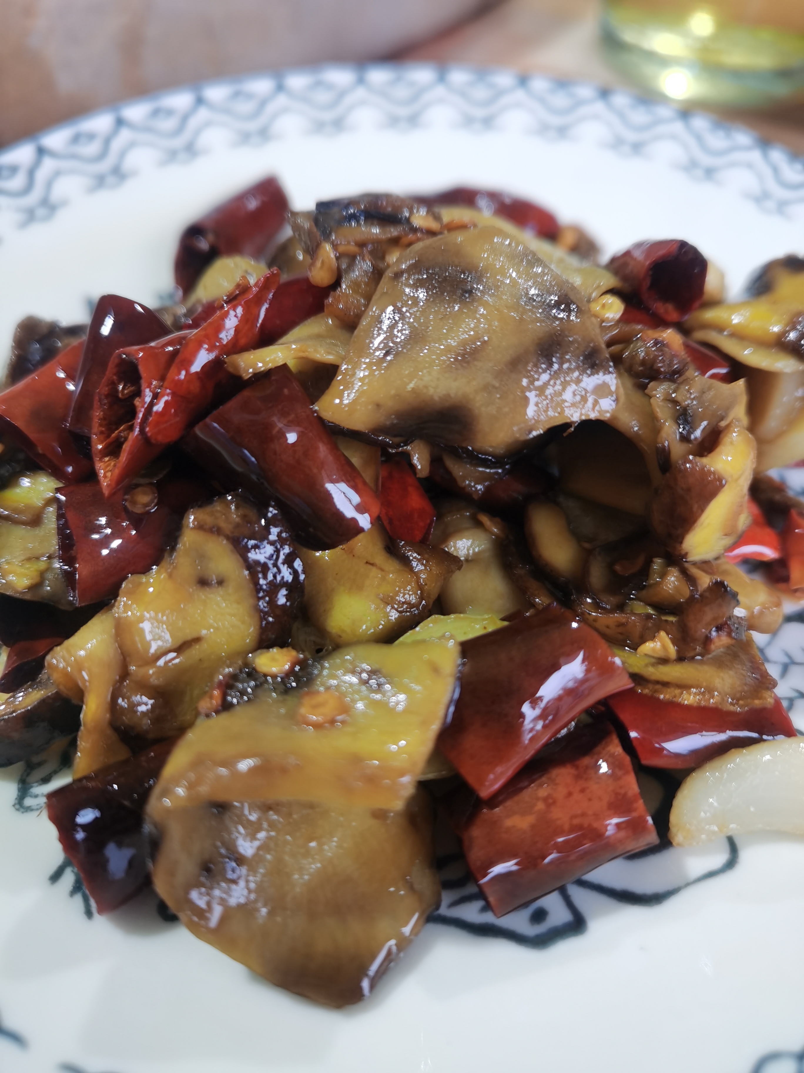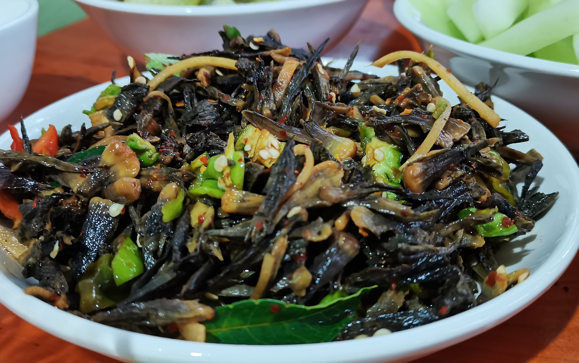 最上头的吃法是将干巴菌撕成螃蟹小腿般粗细的丝丝,与五花肉、青椒一起煸炒,其味妙不可言。不过清洗干巴菌的时候尤其要注意,菌子的褶皱里很容易藏着杂草和松针,要轻轻掰开一遍遍冲洗,之后才能炒出一盘盘黑乎乎却越嚼越有劲儿的山珍。