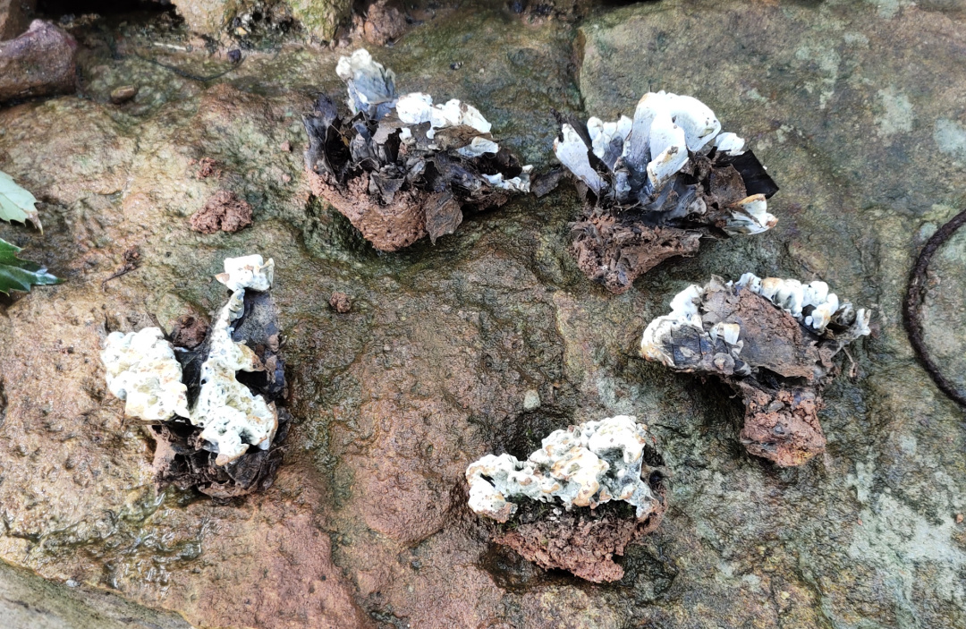 的确,干巴菌喜欢生长在阴暗潮湿的松树下,一坨一坨地缩成一团,如同黑掉的绣球花,说它丑陋一点也不为过。一旦吃到嘴里惊为天人,如同腌制的牛肉干,散发出浓郁香味。
