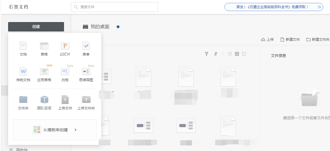 石墨文档可以新建文档、表格、幻灯片、表单、传统文档、应用表格、白板、思维导图、文件夹、团队空间、上传文件、上传文件夹,功能非常的丰富。
