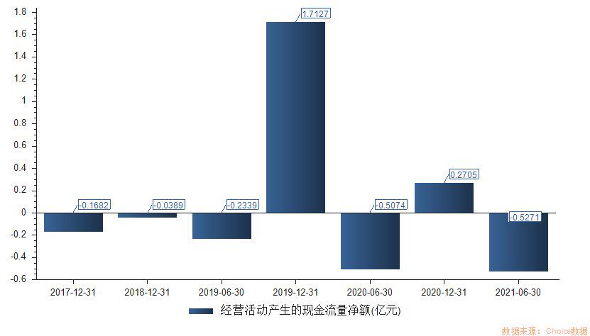 东财choice数据显示,2017-2021年上半年,国盾量子的现金流呈现不健康状态,仅有2019-2020两年年末是正数,分别为1.71亿元和0.27亿元。而2021年上半年公司现金流再次变脸,降至-0.53亿元。