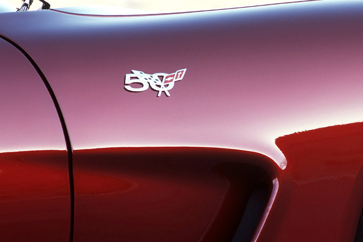 在2003年的时候,正值科尔维特诞辰50周年,科尔维特还推出了50周年纪念款。并且采用了两个独立的logo,其中车头部分的logo采用的是直接在logo中增加50字样,而侧面的logo则采用了以50为背景的设计。