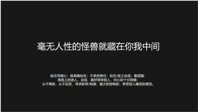 职场暴力的施暴者,通常都有这样的一些性格特性:缺乏同理心;极具操纵性;不承担责任;自恋/迷之自信;撒谎精;表面上的迷人、自信、喜好领导别人;从不悔改;寻求新奇/刺激;强大的控制欲;享受别人痛苦的感觉。