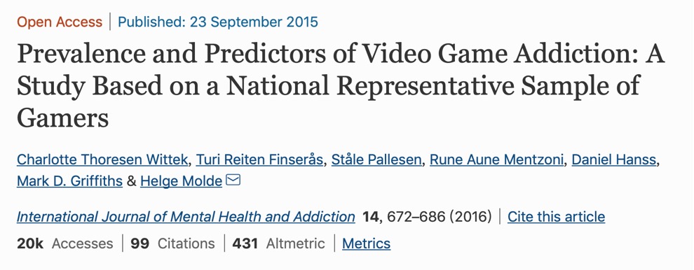 在电子游戏成瘾与五大人格(编注:五大人格是经验开放性、尽责性、外向性、亲和性、神经质)之间的关系上,电子游戏成瘾与尽责性人格呈负相关,与神经质人格呈正相关。身心状况不佳与问题游戏者和沉迷游戏者呈正相关。研究者认为,这些变量之间的关联有助于为如何识别潜在游戏成瘾者。https://doi.org/10.1007/s11469-015-9592-8