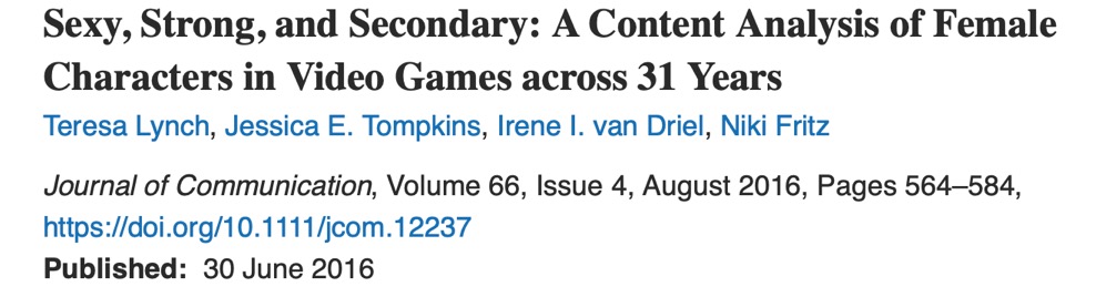 。研究结果表明,自20世纪90年代观察到性化女性角色的高峰以来,女性角色被性化的情况在电子游戏中有所好转。传统意义中以男性为导向的游戏类型(如格斗)比角色扮演型电子游戏有更多远的角色。青少年级游戏与成人级游戏在女性性化程度上没有显著区别,并且相比于每人游戏(everyone game)有更多的女性性化。值得注意的是,尽管游戏中出现了更多女性角色,但这些角色在游戏中常被描述为次要角色,并且相比主要角色有更多的性化(sexualization)特征。女性角色的性化程度与这些角色的身体能力呈现出正相关关系。研究者在文章中用社会认同理论与物化理论对此进行阐释。