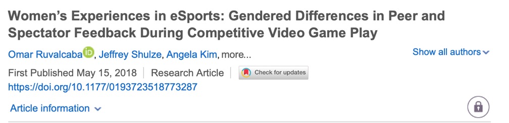 Ruvalcaba等人2018年在Journal of Sport and Social Issues期刊的研究重点关注了女性玩家在男性主导的电竞空间中的反馈以及遭遇性骚扰的经历。在研究1中,研究者分析了在线游戏玩家对不同性别玩家和观众所呈现的反馈态度的差异。在研究2中,研究者在游戏观察中分析了玩家的性别差异,这些观察集中在Twitch(一个流行的视频游戏流媒体网站)上观众对女性和男性游戏者的评论。 研究结果表明,与男性相比,女性玩家在网络游戏中的体验是混合的,且包含了更多的性骚扰。https://doi.org/10.1177/0193723518773287