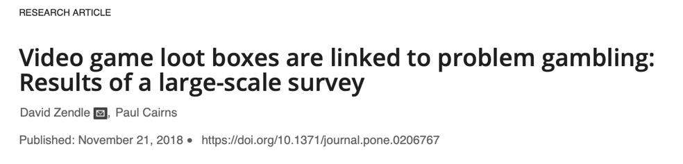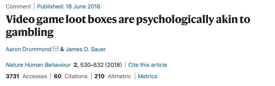 2018年Aaron和James在Nature期刊上评论道,电子游戏战利品盒与赌博行为具有心理接近性。作者通过赌博与战利品盒的定义梳理得出,在鼓励和维持用户参与的方式上,战利品盒与赌博具有重要的结构和心理相似性。作者提出了三项建议:1)ESRB(编注:ESRB为美国游戏分级制度)等其他评级机构和赌博监管机构应考虑将涉及战利品盒的电子游戏限制在合法赌博年龄阶段的人访问;2)相关机构应对涉及战利品盒的游戏加强审查,并适当提高游戏的推荐最低年龄;3)相关机构应详细说明关于战利品盒的运作机制以帮助游戏消费者与家长做出更明智的决定。